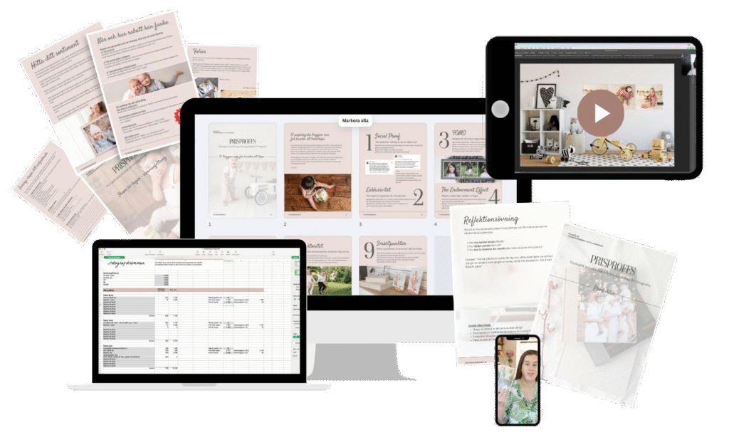 Fristående fortsättningskurs av Pengapepp. Få hjälp att bygga paket, lär dig avancerade säljstrategier och får insikt i kundpsykologi. Kursen ger dig praktiska mallar, guider och tekniker som fungerar i verkligheten, oavsett om du jobbar med bröllop, gravid eller familjefoto.